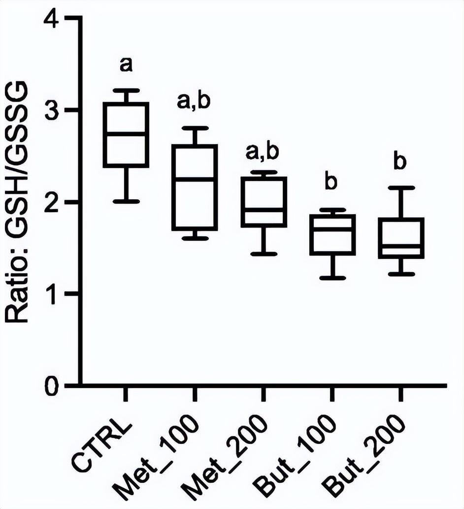 与对照组相比,氧化型谷胱甘肽在用对羟基苯甲酸丁酯治疗的组中显著增加。GSSG的这种差异反映在谷胱甘肽的还原能力上,因为用对羟基苯甲酸丁酯治疗的两组显示出显著的降低(p < 0.005) 。