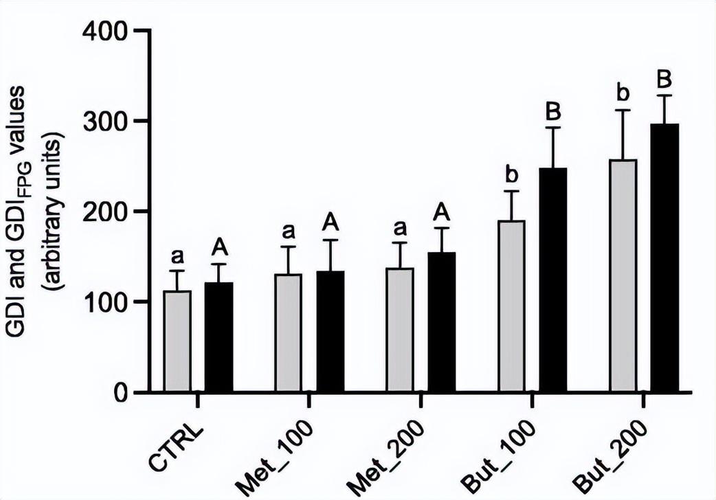DNA损伤分析。4个独立实验的标准差。DNA链断裂,以遗传损伤指数表示,以及DNA链断裂加上氧化损伤,用甲酰胺基嘧啶DNA糖苷酶(Fpg)测定并以GDI表示空腹血糖,在大鼠睾丸细胞中。由Tukey’s确定的标有相同字母的值在各组之间没有统计学意义因此测试。
